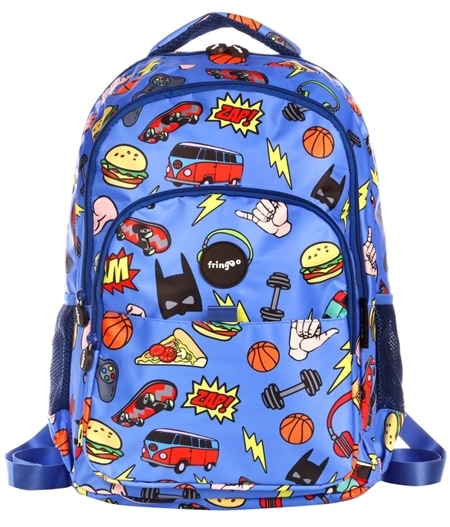 Mega sej rygsæk fra Fringoo. Tasken er med gode inddelings muyligheder, med flere lynlås rum. Den har små net rum på begge sider til drikkedunk eller småting. Stropperne kan justeres og tasken er lavet i vandafvisende materiale med det sejeste print af ly
