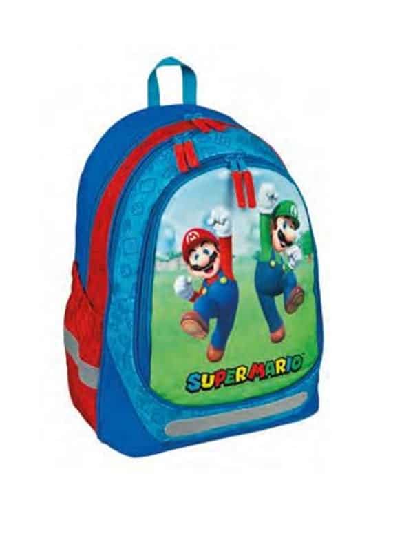 Super Mario rygsæk med 3 rum, justerbare skulderstropper, refleksstriber og vandafvisende bund. Tasken måler 31 cm × 43 cm og har en kapacitet på cirka 17 liter.